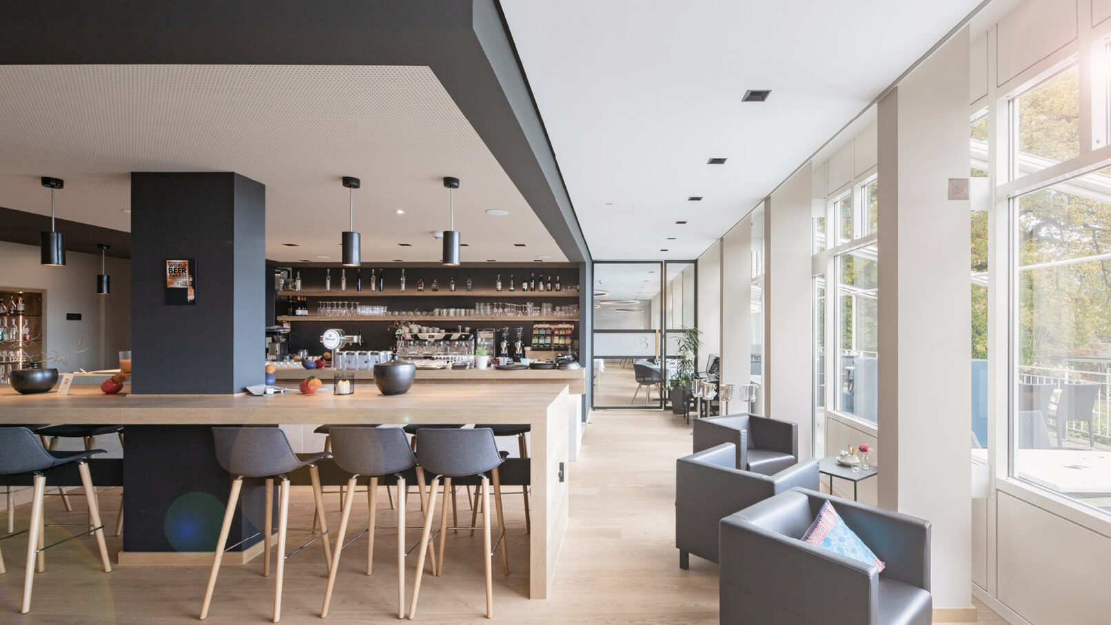 Ein ganz besonderes Projekt war die Sanierung des Seehotels Maria Laach, an dem ich nach meiner Tischlerlehre 2004 in der Klosterschreinerei nun selbst mitwirken durfte. In Zusammenarbeit mit Fries Architekten und den Bauherren entschieden wir uns für einen dezenten, zeitlosen Look. Warme Farben und elegante Architektur prägen das Design, wobei das Lichtkonzept akribisch auf die räumlichen Gegebenheiten abgestimmt wurde, um eine unaufdringliche, harmonische Atmosphäre zu schaffen. Diese gestalterische Zurückhaltung sorgt dafür, dass das Seehotel Maria Laach eine einladende Ruhe ausstrahlt und den Gästen ermöglicht, die Schönheit der Umgebung in vollen Zügen zu genießen.