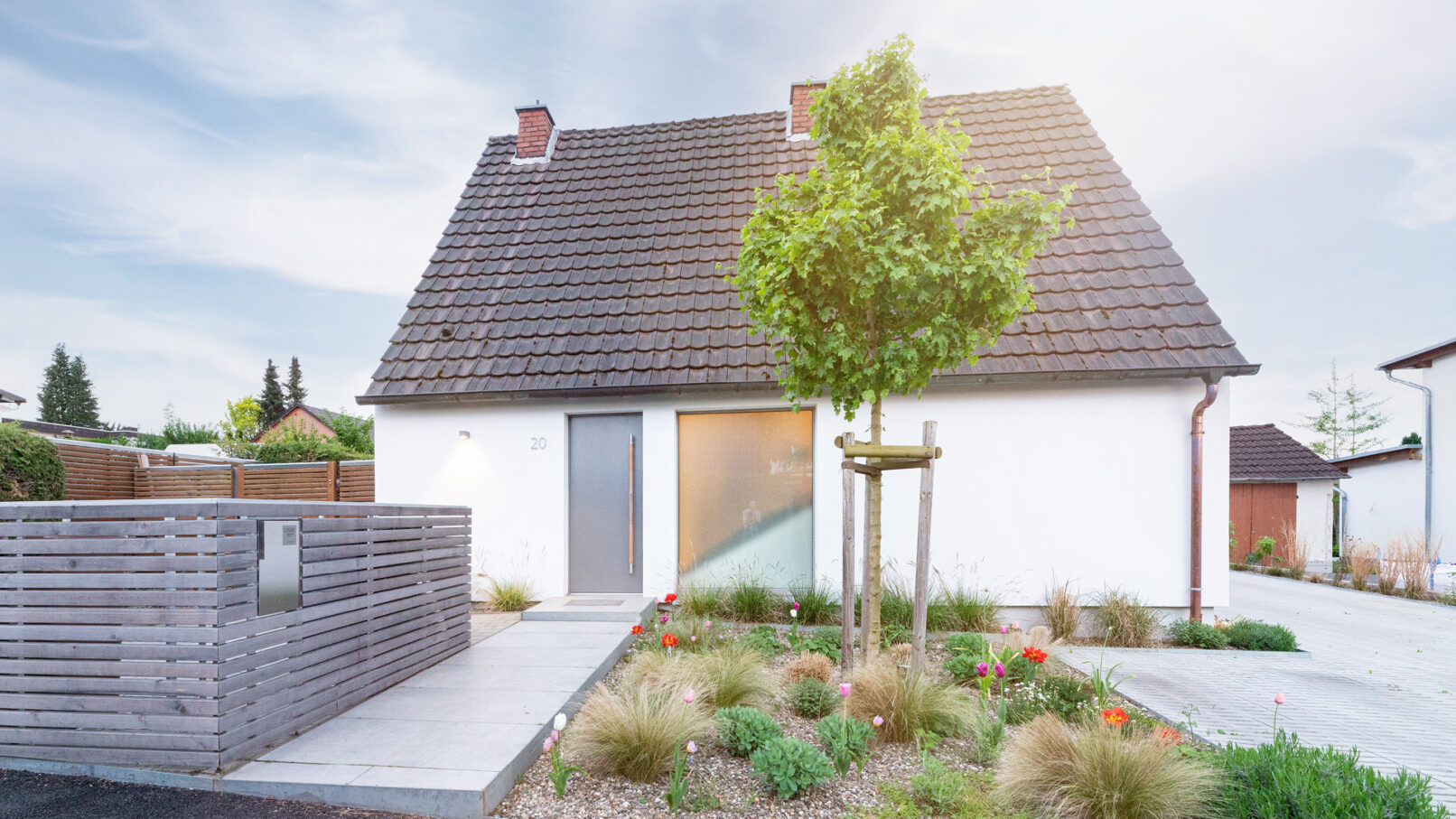 Neben der Erneuerung der Kellerabdichtung wurde die Zufahrt neu gestaltet – klar strukturiert und gerahmt von einer maßgeschneiderten Mülltonnenabtrennung mit integriertem Briefkasten. Auch die Fenster erhielten neue Formate und Raffstores, die nicht nur für besseren Sonnenschutz, sondern auch für ein harmonischeres Gesamtbild sorgen.